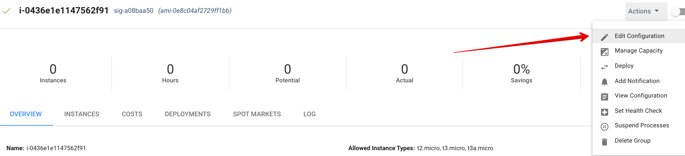 1. In the overview page for an Elastigroup, open the Actions menu and click Edit Configuration.